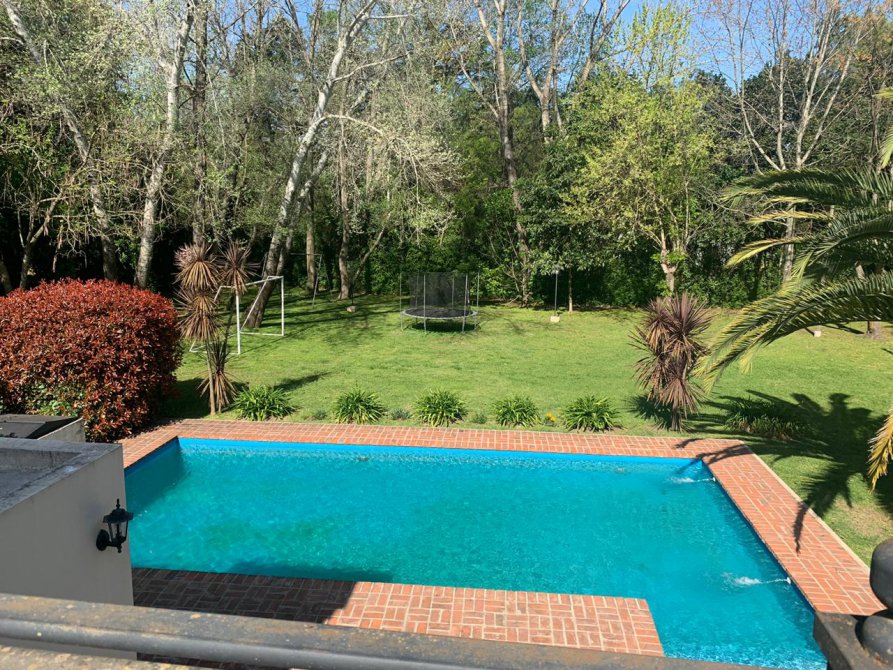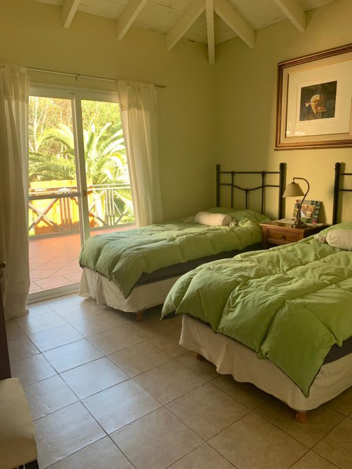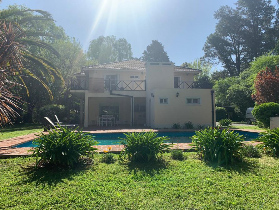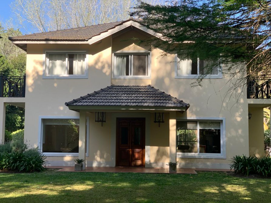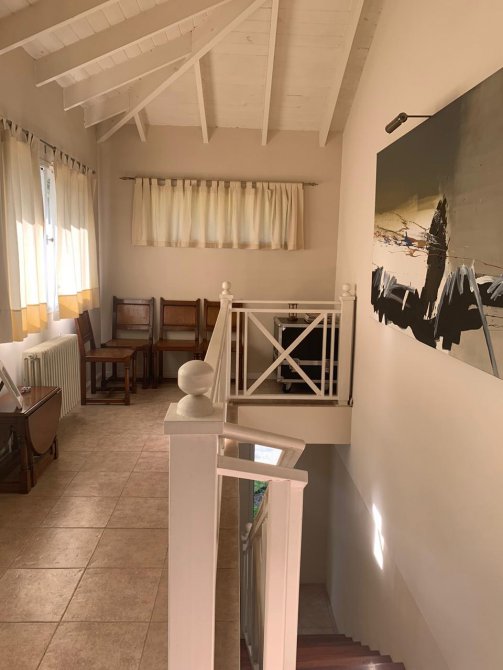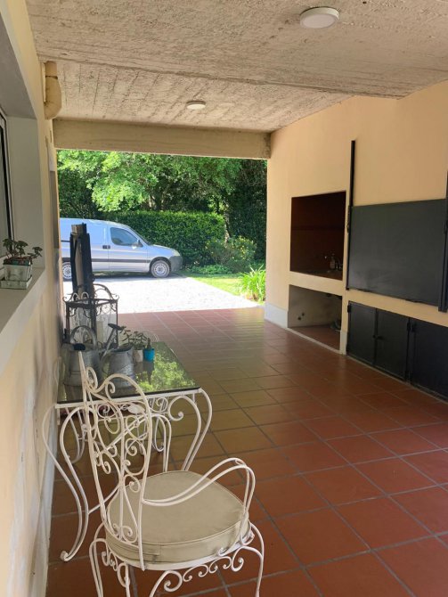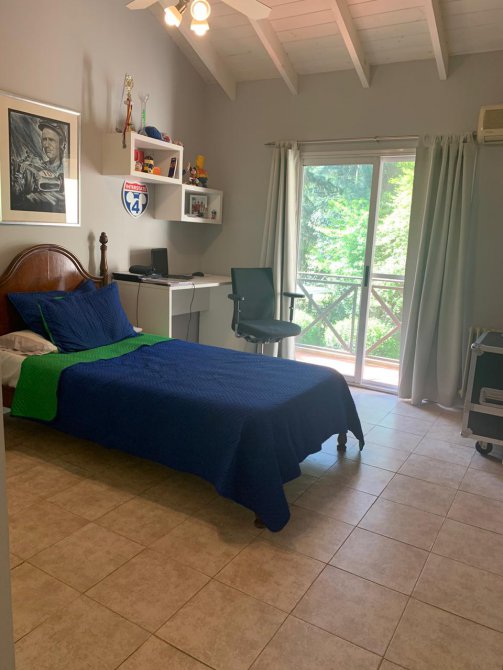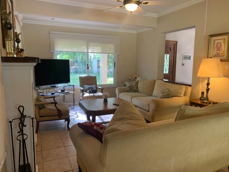 En su exterior se aprecia un amplio parque lleno de plantas frondosas, arbustos variados, números riegos. Piscina con área de solárium, galpón y baño, una galería abierta con parrilla. En su interior se encuentra el recibidor, la sala de estar, comedor, cocina, lavadero, baño, escritorio. Por las escaleras se llega a la planta alta donde tenemos otra sala de estar con balcón, por otro pasillo las cuatro habitaciones y dos baños. Tres habitaciones con una magnifica vista al parque desde las terrazas.
