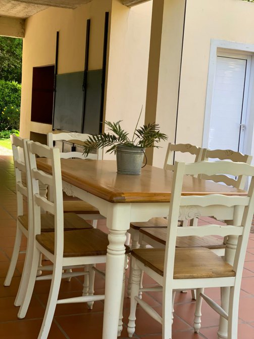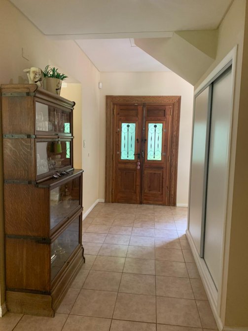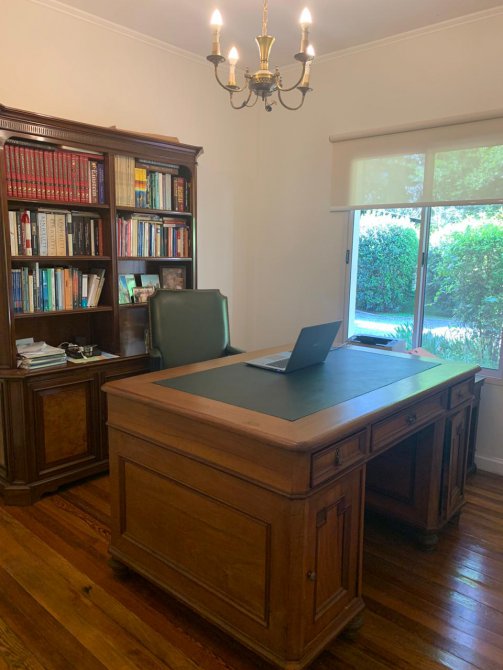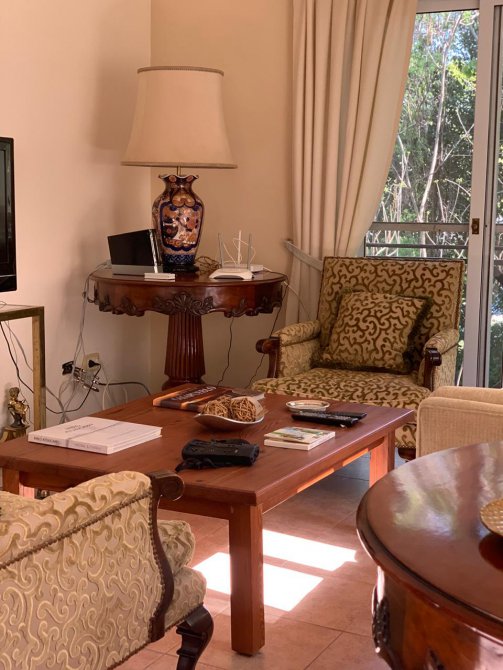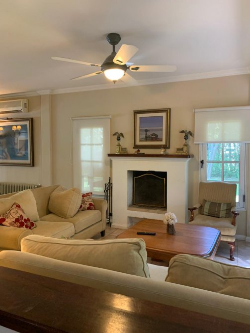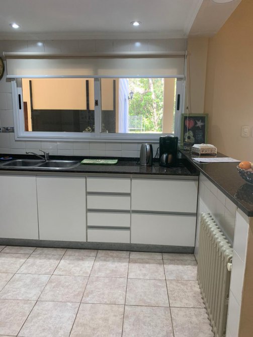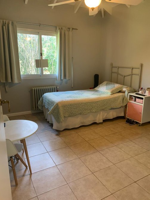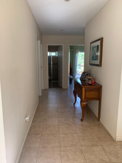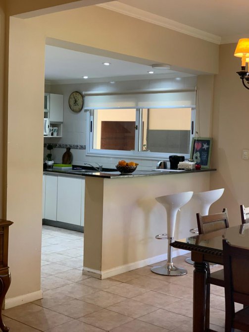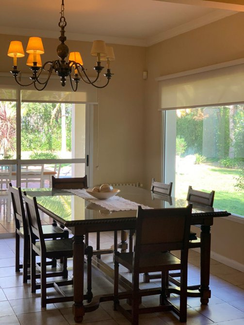 En su exterior se aprecia un amplio parque lleno de plantas frondosas, arbustos variados, números riegos. Piscina con área de solárium, galpón y baño, una galería abierta con parrilla. En su interior se encuentra el recibidor, la sala de estar, comedor, cocina, lavadero, baño, escritorio. Por las escaleras se llega a la planta alta donde tenemos otra sala de estar con balcón, por otro pasillo las cuatro habitaciones y dos baños. Tres habitaciones con una magnifica vista al parque desde las terrazas.
